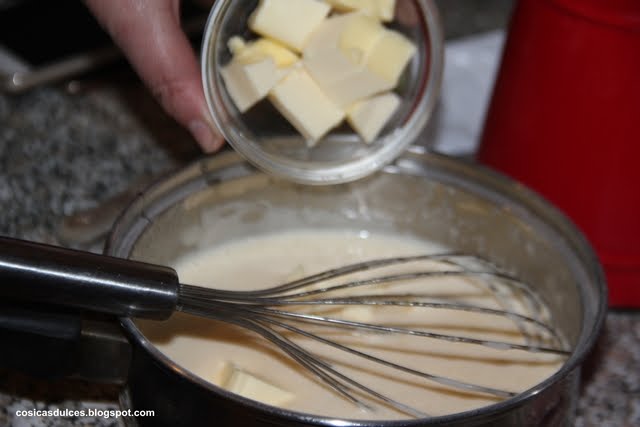 Incorporamos el zumo de limón y la mantequilla cortada a dados y llevamos al fuego sin dejar de remover hasta lograr una crema espesa.