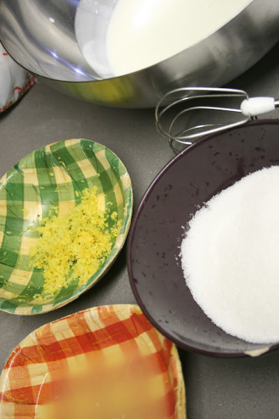 Cuando veamos que la nata (crema de leche) está montada le echamos el azúcar y volvemos a batir, después echamos el zumo y la mitad de la ralladura, la otra mitad para decorar.