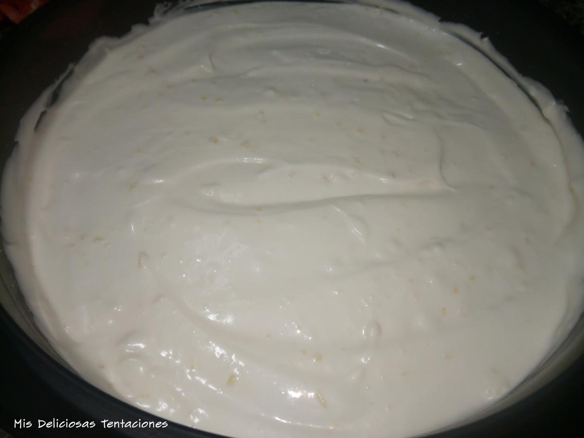 Sacamos el molde del frigorífico y vertemos la mezcla, con una espátula aplanamos la superficie ( no dar golpes para aplanar ).