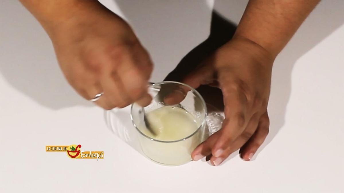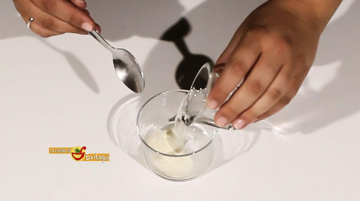Comienza poniendo en un recipiente la grenetina o gelatina neutra e hidrátala con las cucharadas de agua. Remueve y reserva.
