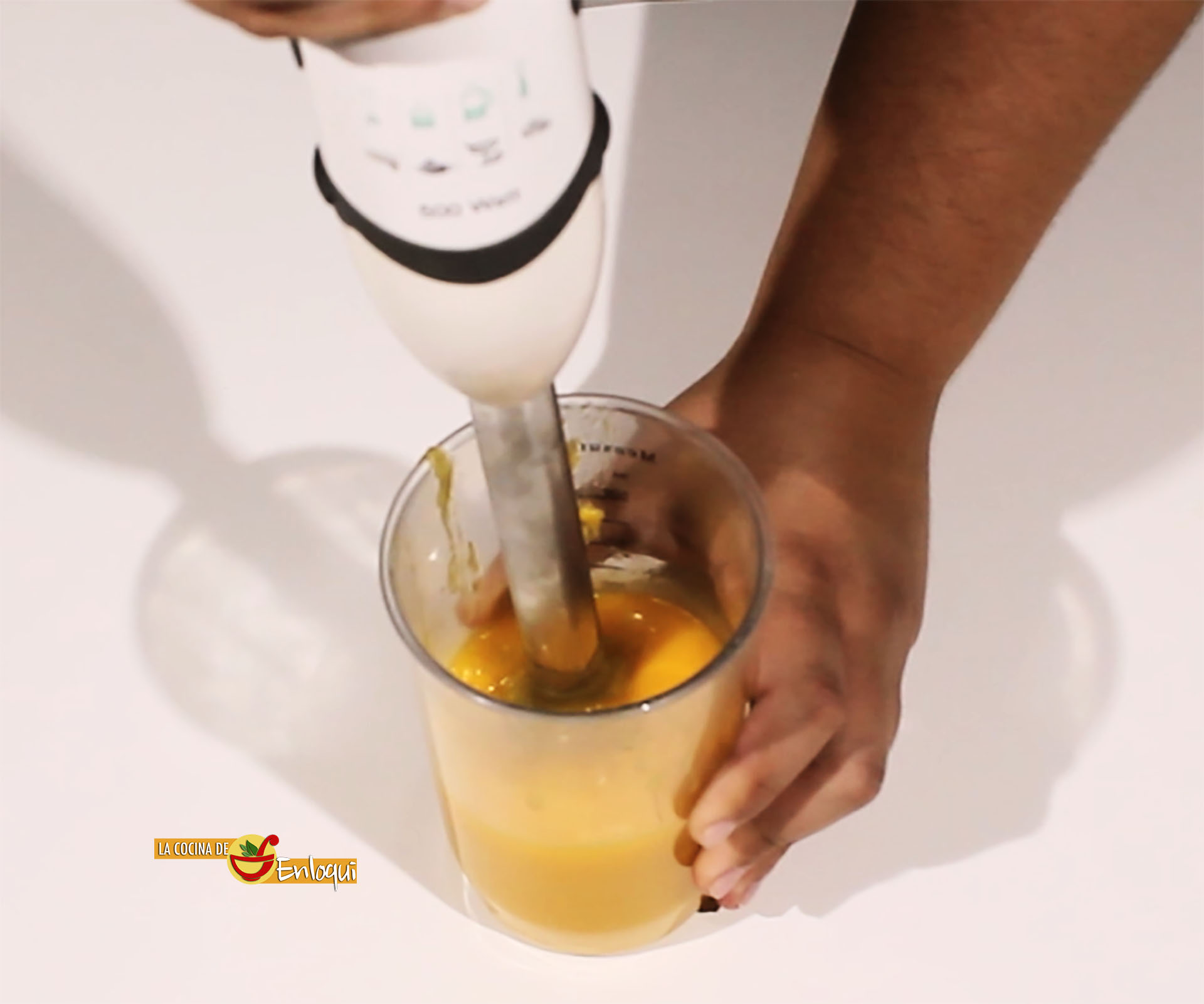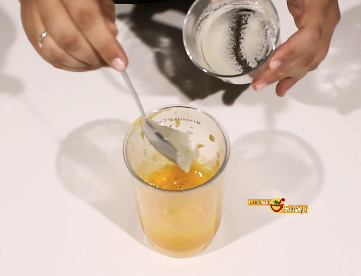 Por otro lado coloca en el vaso de la batidora la pulpa del mango y tritura. Cuando esté completamente triturado añade la mezcla de la grenetina y vuelve a batir con la batidora hasta que quede bien mezclado. Reserva.