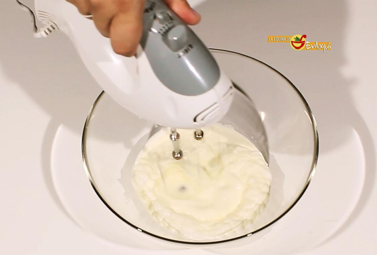 En un bol monta la nata (crema de leche) con las varillas eléctricas. Comienza batiendo y cuando comience a estar semimontada añade el azúcar, sin dejar de batir hasta que quede bien montada y consistente. Recuerda que, para que la nata (crema de leche) monte bien, es importante que esté bien fría. Te recomiendo guardar en el congelador unos minutos antes de usar.