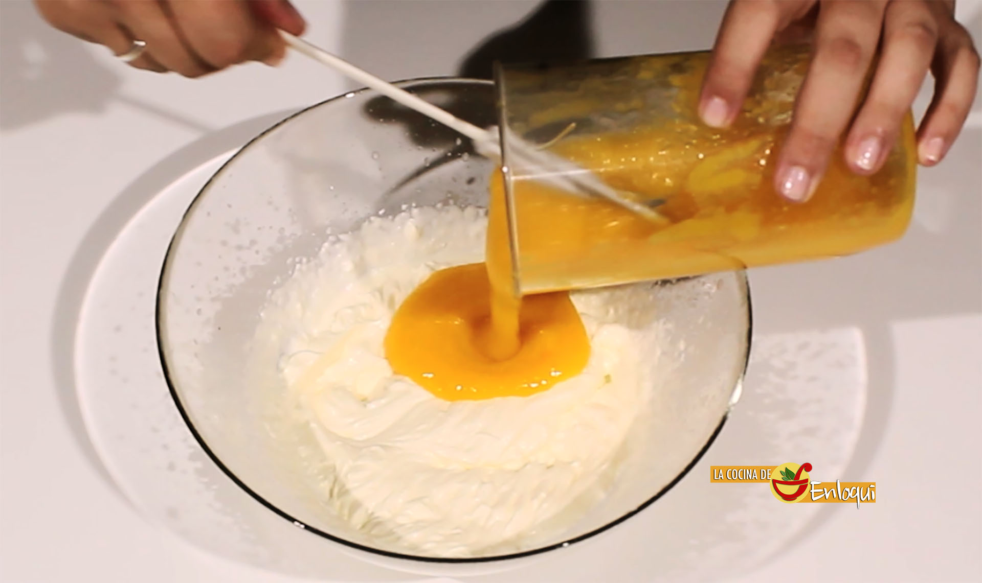 Cuando la nata (crema de leche) quede bien montada añade poco a poco la mezcla que tenías reservada del puré de mango. Mezcla con movimientos envolventes para que la nata (crema de leche) no pierda volumen y nos quede un postre bien cremoso y con la textura de mousse.