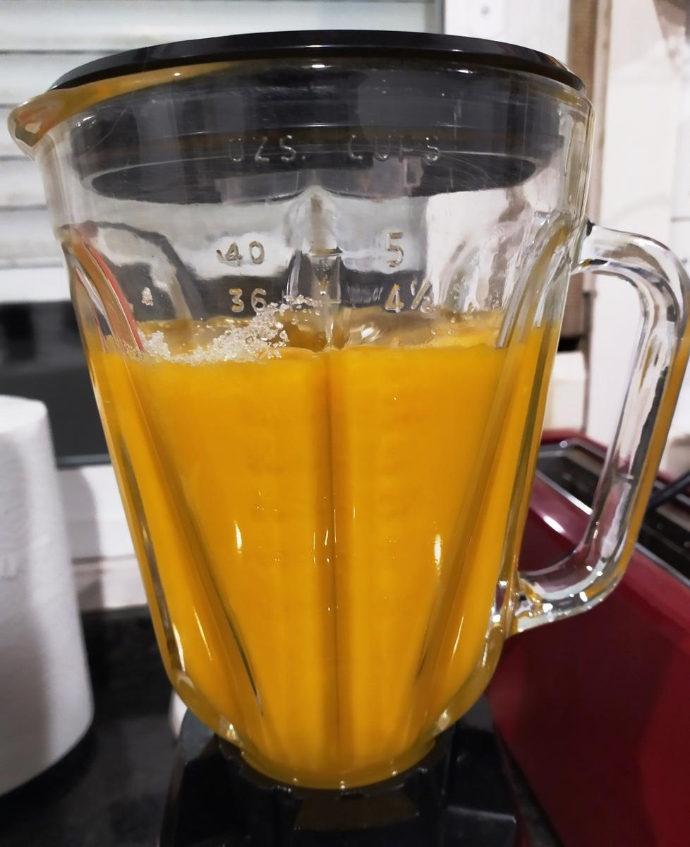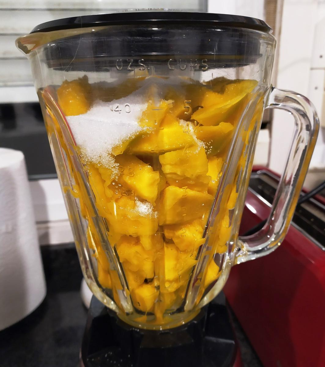 Empezaremos pelando y troceando el mango y lo pondremos en el vaso de la batidora con tres cucharadas de azúcar. Remojamos la gelatina en agua fría, la disolvemos en el microondas durante unos segundos y se la añadimos a la pulpa de mango. Batimos todo muy bien y pasamos la mezcla a un bol.