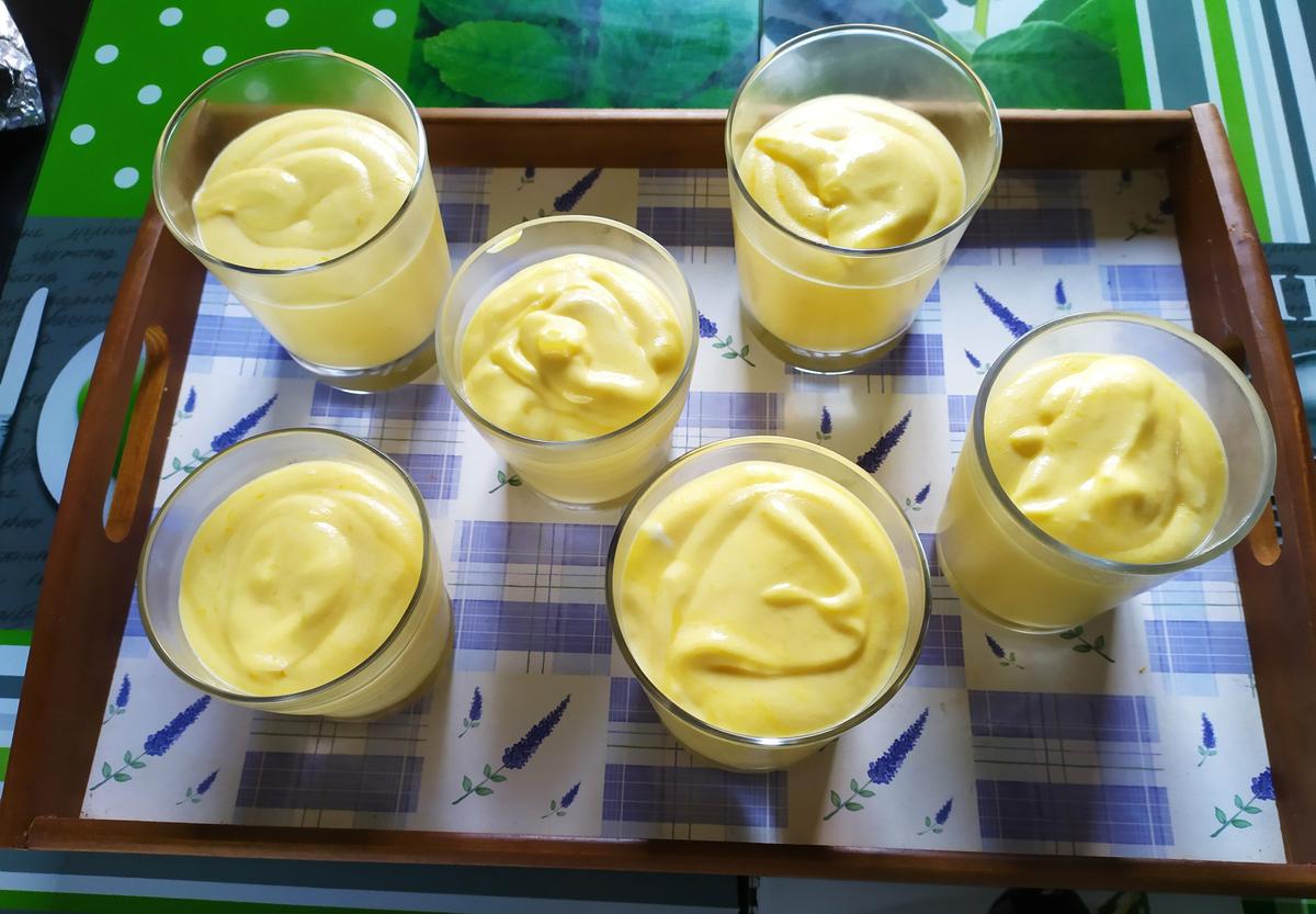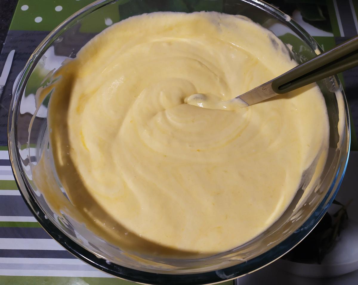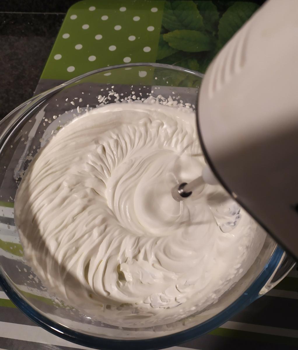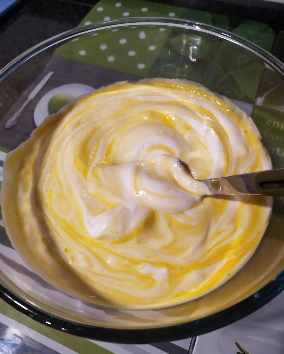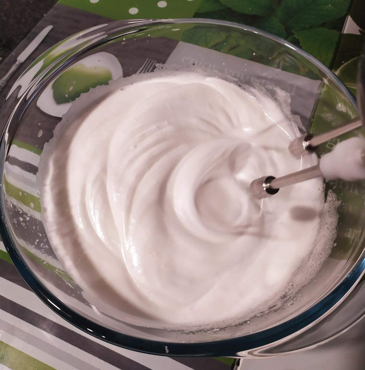 Montamos las claras a punto de nieve con cinco cucharadas de azúcar y se las añadimos a la crema de mango con movimientos envolventes. Después montamos la nata (crema de leche) y la añadimos también, poco a poco, a la mezcla anterior.