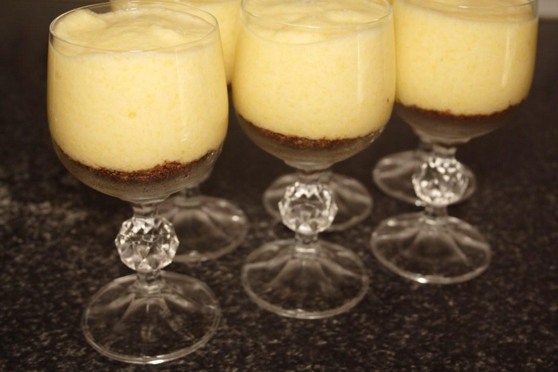 Repartimos en las copas, damos unos golpecitos con las copas en la encimera, con el fin de evitar burbujas e introducimos en el frigorífico durante al menos 1 hora.
