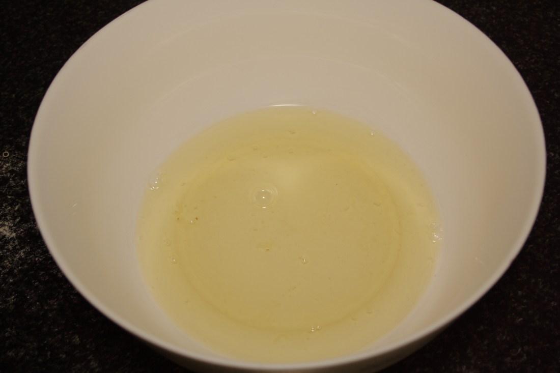 En un recipiente apto para microondas calentamos el chorrito de agua, introducimos la gelatina hidratada y bien escurrida, removemos hasta que se disuelva, reservamos.