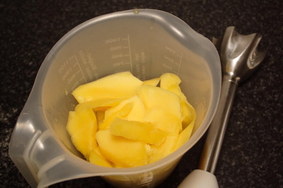 Pelamos y troceamos los mangos, los colocamos en una jarra o vaso batidor y trituramos con la batidora.