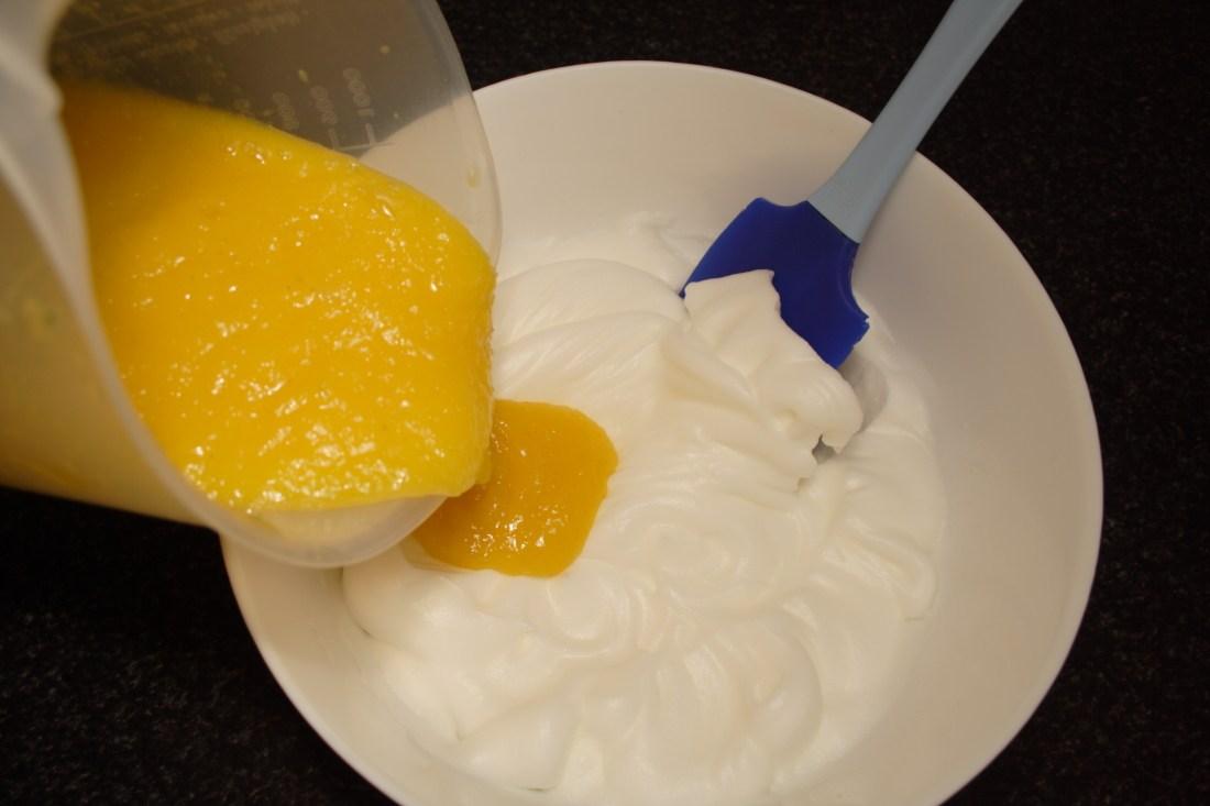 Montamos las claras a punto de nieve con las varillas eléctricas. Una vez montadas añadimos el puré de mango y mezclamos suavemente con movimientos envolventes.