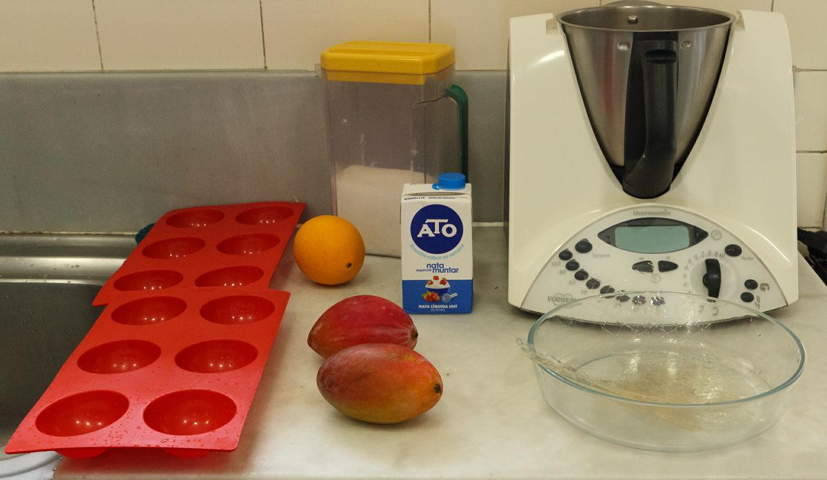Pelamos los mangos y cortamos en trozos y reducirlo a puré con el zumo de naranja.