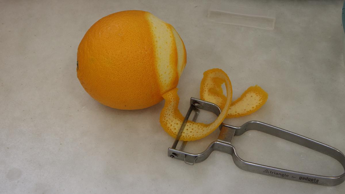 Pelamos la naranja, con un pelador evitando la parte blanca, solo la corteza. exprimimos la naranja, la ponemos en el el fuego con la corteza.