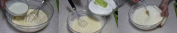 Le añadimos la leche con la gelatina al queso y mezclamos bien, Por último añadimos las claras montadas con movimientos envolventes.