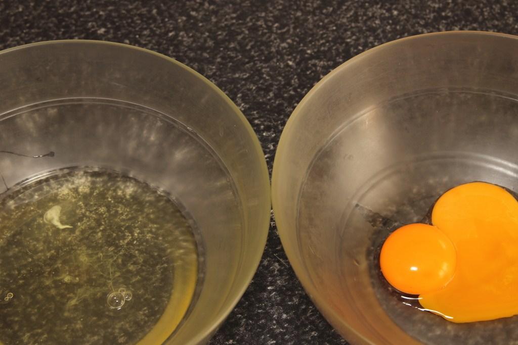 Escurrimos los trozos de melocotón del almíbar y trituramos la compota de melocotón con las yemas, reservamos.