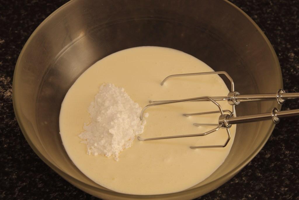 Ponemos el brick de nata (crema de leche) a refrescar en un bol con hielos en la nevera una media hora antes de comenzar la receta.