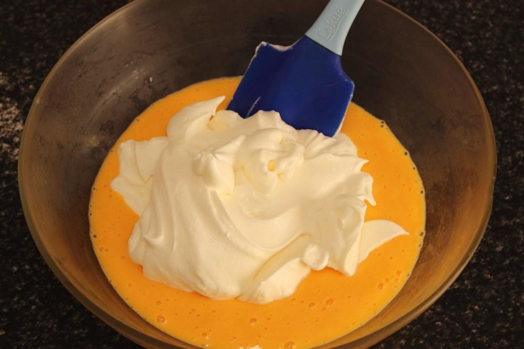 Montamos las claras con la otra cucharada de azúcar, con las varillas eléctricas, que quede consistente e incorporamos el merengue a la crema de la nata (crema de leche). Mezclamos suavemente de nuevo.