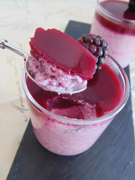 Preparación: En primer lugar hidratamos las hojas de gelatina en agua fría. Prepararemos el sirope de moras que nos servirá para las dos capas de nuestro postre. Lavamos y escurrimos bien las moras. Las trituramos y colamos las pepitas. Añadimos a un cazo junto al azúcar, chorrito de limón (para que conserve el color) y el vinagre de Jerez Pedro Ximénez. Éste le aportará el toque semidulce y un sabor suave que contrasta al zumo de moras.