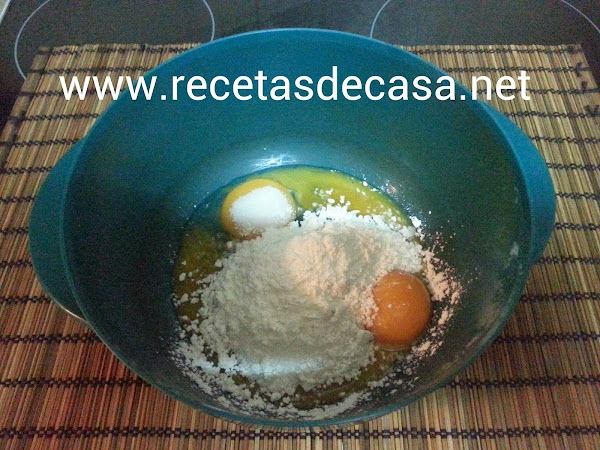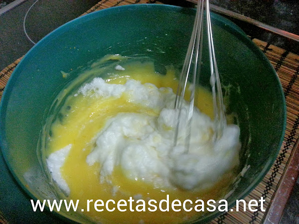 En un bol, ponemos las yemas con el azúcar, la harina, el zumo de naranja y la ralladura de naranja y limón.