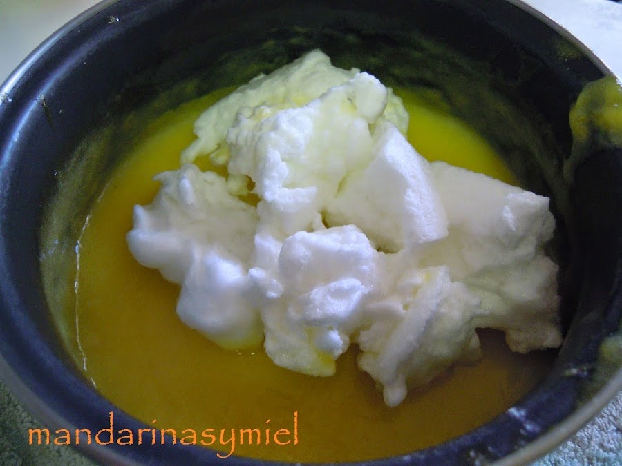 Deja que se enfríe y añade las claras montadas, mezcla bien.