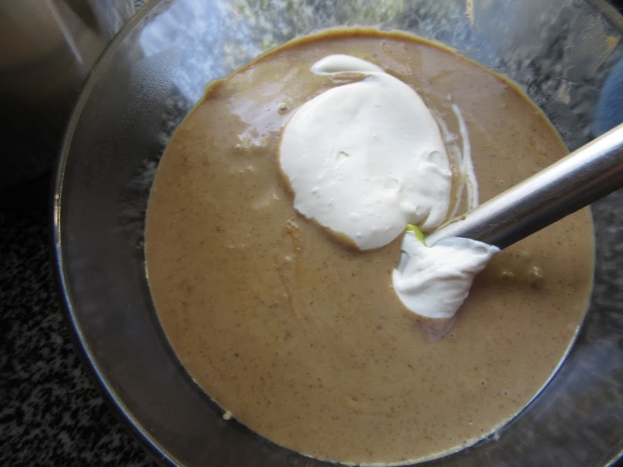 4- Montar la nata (crema de leche) bien fría con varillas y unir a la crema. Primero poner un poco de nata (crema de leche) en la crema y al contrario, con movimientos envolventes.