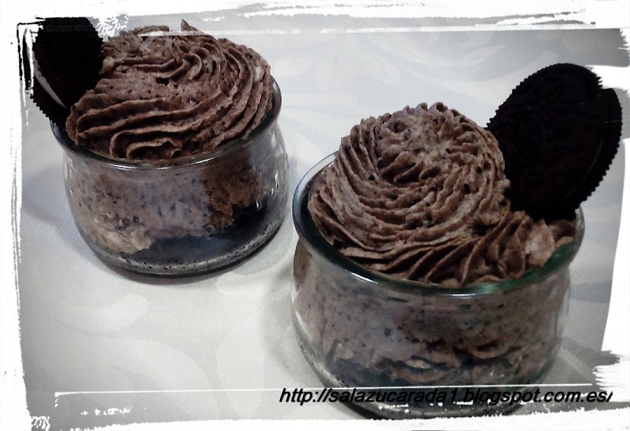 Como se hace : Comenzamos por meter en el congelador el brik de nata (crema de leche). Mientras se enfria vamos separando la parte blanca de la galleta oreo, la ponemos en un bol y las galletas las trituramos , bien con un procesador de alimemtos si tenemos, con la thermomix o con el rodillo de cocina . Una vez las tengamos trituradas mezclaremos en un bol pequeño, dos cucharadas de la galleta triturada con la mantequilla que previamente habremos derretido, ponemos esta mezcla e el fondo de dos vasitos de cristal ( si reciclais los vasitos de yogur comerciales, os dará para 4 vasitos ) y apretamos bien con una cucharita para que se quede uniforme. Metemos en la nevera mientras preparamos el mousse . Batimos la nata (crema de leche) , cuando empieze a montar, añdimos el azúcar glas y seguimos montando hasta que esté espesa pero no muy firme . Ponemos el queso en el bol donde tenemos la parte blanda de las galletas y mezclamos bien con una cucharada cuando empieze a estar cremoso, seguimos con una varillas . Una vez esta crema esté homogénea, le añadimos la galleta triturada y mezclamos bien, por ultimo le agregamos la nata (crema de leche) montanda y vamos integrando ambas mezclas con movimientos envolventes. La ponemos en una manga pastelera y rellenamos los vasitos. Metemos en la nevera lo justo para que el postre esté frio , un par de horas serán suficientes