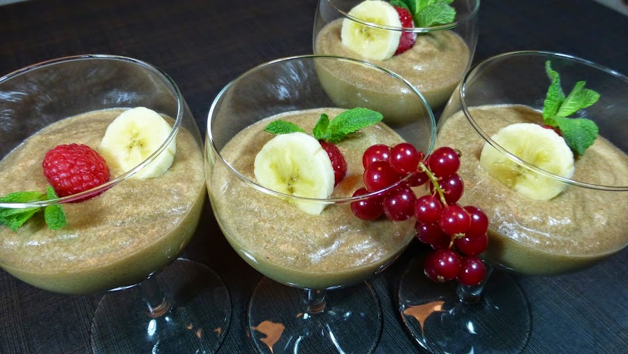Pasada la hora en el frío ya podemos servir. Es el momento de decorar a nuestro gusto. Como ves en la foto con una frambuesa y unas hojitas de menta queda muy bien. Si no tienes pon unas ruedas de plátano al llevar a la mesa.