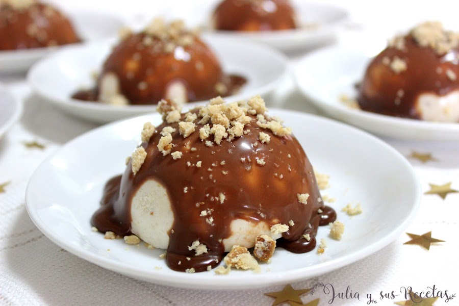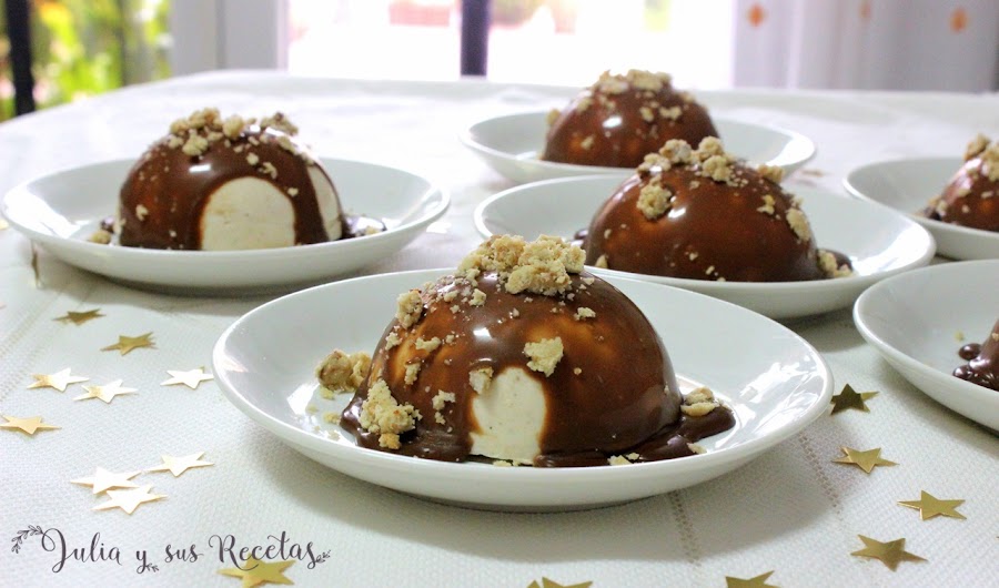 Desmoldamos la mousse y les ponemos un poco de chocolate por encima.