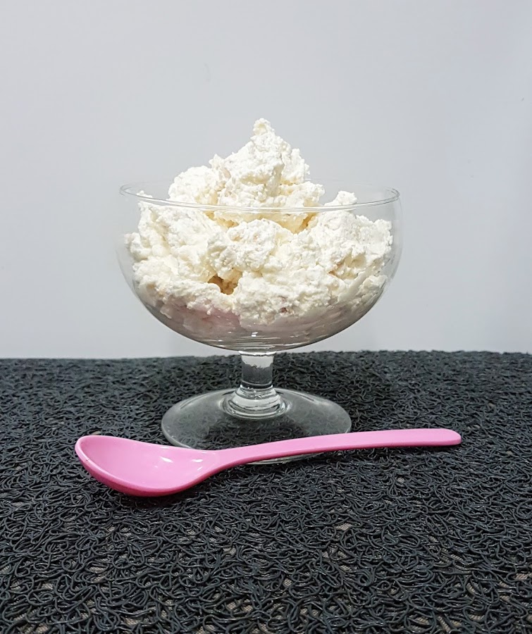 Por otro lado, montamos la nata (crema de leche) junto con el azúcar con ayuda de unas varillas eléctricas. Cuando la nata (crema de leche) esté firme añadimos los polvorones y mezclamos con una espátula con cuidado de que la nata (crema de leche) no se baje.