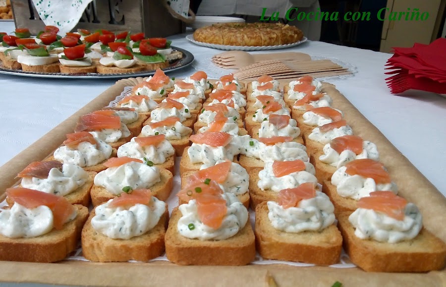 Metemos en manga pastelera con una boquilla bonita y vamos colocando sobre unas galletitas crujientes. Le ponemos un trozo de salmón ahumado encima y perfecto