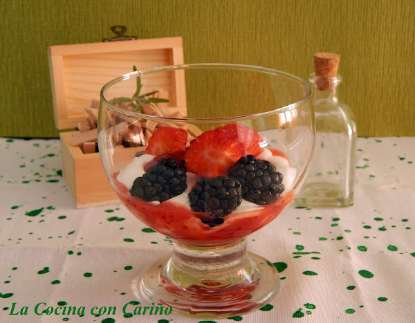 En el fondo de la copa, ponemos la salsa de fresas, encima colocamos un par de cucharadas de mousse y sobre esta colocamos unas fresas cortadas en el centro de la copa y en el perímetro las moras y las frambuesas.