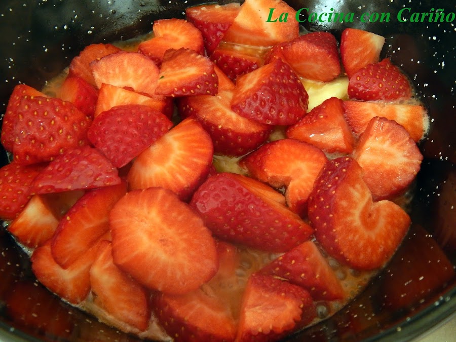 Vamos a empezar por la salsa. Es muy simple. Ponemos a fuego suave la mantequilla con las fresas a trozos y el azúcar. Añadimos el zumo de limón y dejamos cocer. Las fresas empezarán a soltar el jugo y las aplastaremos con un tenedor. Cuando veamos que empieza el jugo a formar hebra, apagamos y dejamos reposar.