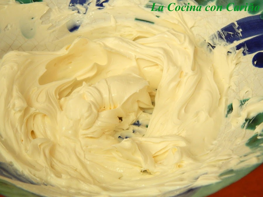 El queso de untar lo empezamos a batir con varilla, hasta que vemos que empieza a brillar, como en la foto. Es el momento de añadir la nata (crema de leche), las gotas de vainilla y el azúcar. Todo en frío. Iremos montando con las varillas, hasta que vemos que estas dejan surco en la emulsión. Es el momento de parar, porque no queremos una nata montada (crema de leche), sino una crema suave. Refrigeramos ½ hora y empezamos a montar el plato.