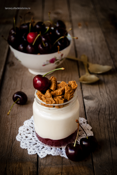En las fotos he presentado los vasitos como si fuera una cheesecake invertida, con la mermelada abajo y las galletas a trozos arriba para variar. Podéis poner la mermelada que más os guste, la verdad es que el queso casa bien con todo o al menos a mí así me lo parece.