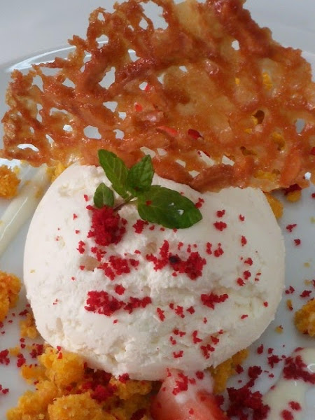 En un plato poner tierra de zanahorias, es decir el bizcocho desmigado. Encima una semiesfera de la mousse, unas fresitas, cortadas, un poco de la salsa de yogur y el crujiente. Cada uno tiene sus ideas ya su forma de emplatar. Así que esto es sólo una sugerencia.