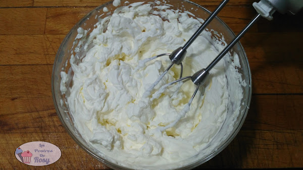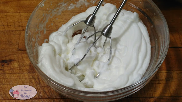 - Montamos la nata (crema de leche) bien firme y reservamos en la nevera.