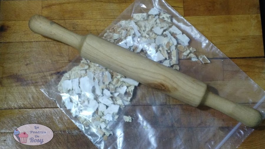 - Con la ayuda de un rodillo o una picadora, pulverizamos el turrón.