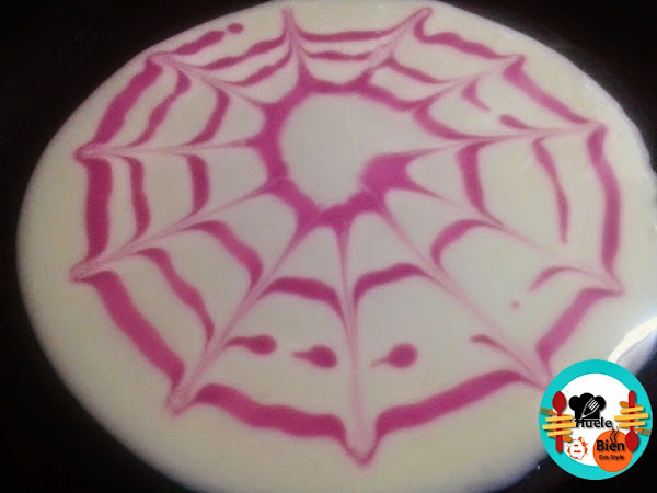 5.- Vertemos el chocolate en un plato de postre. Hacemos una espiral con el chocolate que hemos colorado de rojo, sobre el chocolate blanco. Con una brocheta trazamos 10 lineas rectas.