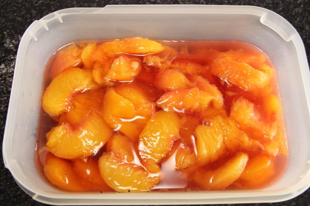 Sacamos la fruta del almíbar con una espumadera, retiramos la piel aprovechando los cortes que les hemos hecho, quitamos el hueso y cortamos la pulpa en trozos no demasiado grandes. Devolvemos la fruta al almíbar junto con el ron (o nuestro licor favorito). Dejamos que enfríe, metemos en un táper, cerramos bien y guardamos en la nevera hasta el día siguiente (mejor si lo dejamos toda la noche).