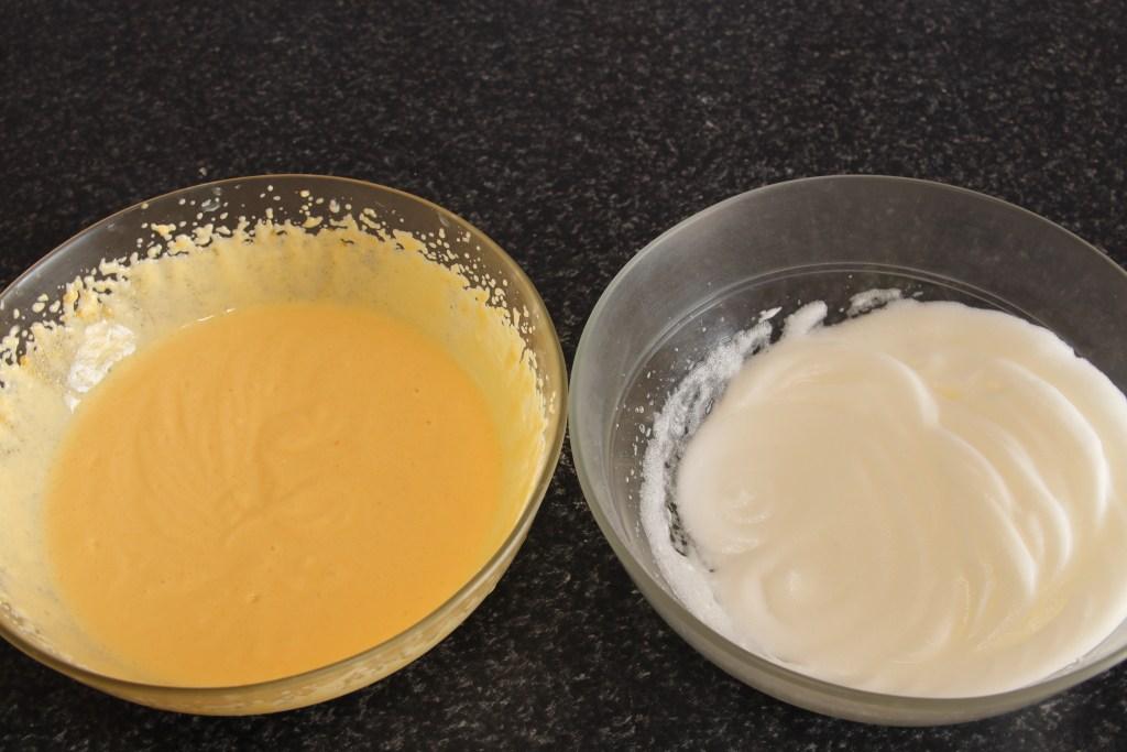 Separamos las claras de las yemas. En un bol blanqueamos las yemas con el azúcar, con ayuda de unas varillas eléctricas, que quede una crema espumosa y añadimos el queso, seguimos batiendo hasta que quede una crema homogénea y sin grumos. Montamos las claras a punto de nieve con una varillas eléctricas y las vertemos sobre la crema de queso, suavemente y con movimientos envolventes.