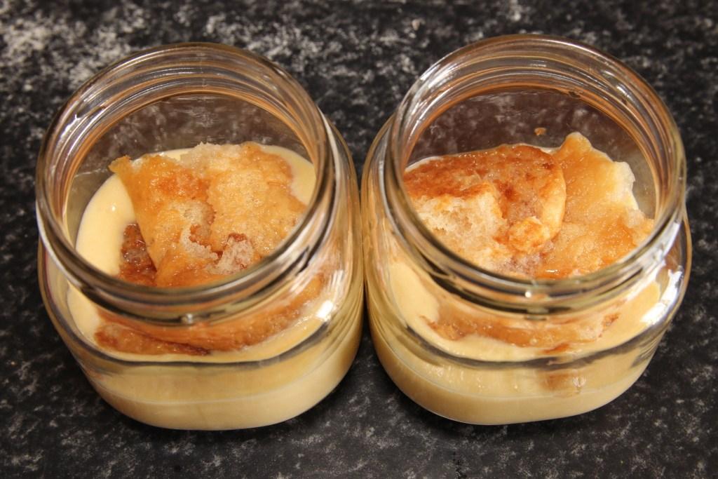 Vertemos la mitad de la mousse en los tarros y cubrimos con un bizcocho empapado de almíbar.