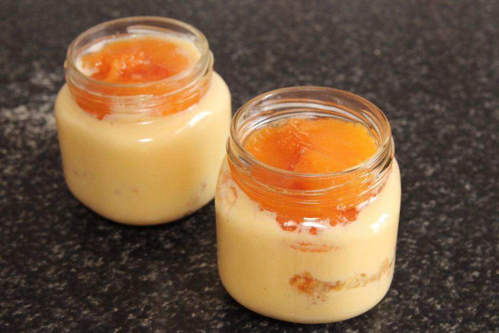 Repartimos la otra mitad de la mousse sobre los bizcochos y cubrimos con los gajos de melocotón y nectarina, sin llegar al borde de los tarros. Refrigeramos como mínimo durante 2 horas.