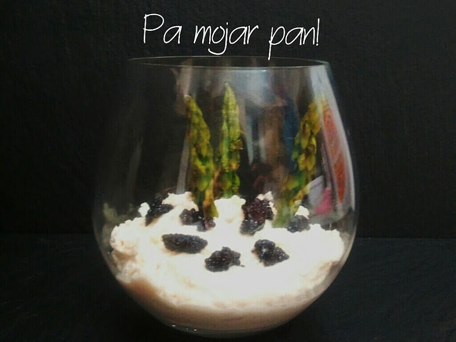 Ya solo nos queda montar el plato. Para ello sacamos la manga pastelera de la nevera y colocamos una pequeña cantidad de nuestro mousse en el vaso que hemos elegido para la presentación (unos dos dedos aproximadamente). Por encima vamos poniendo unas cucharaditas del sucedáneo de caviar y por último plantamos nuestras puntas de espárrago.