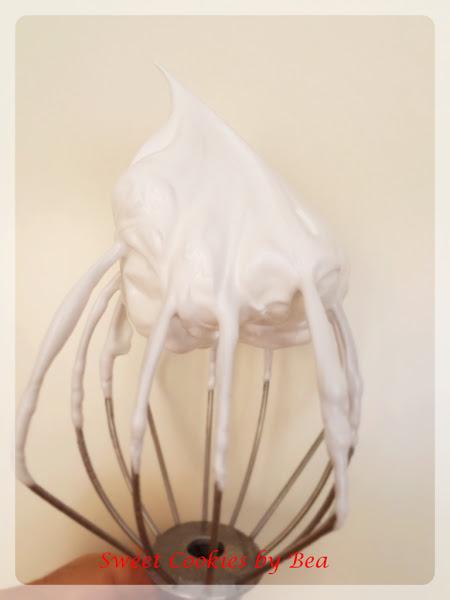Este almíbar se lo añadimos a la mezcla montada que tenemos reservada sin dejar de batir a máxima velocidad, lo vamos añadiendo poco a poco, como un hilo que caiga sin que toque las paredes de nuestro recipiente. Sabremos que está listo cuando tenga un tono brillante