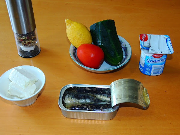 Una lata de sardinas en aceite, la ralladura y el zumo de medio limón, un tomate pequeño, un yogur blanco (puede ser desnatado), 500 gr. de queso blanco y pimienta. Para decorar: zanahoria, pepino y menta.