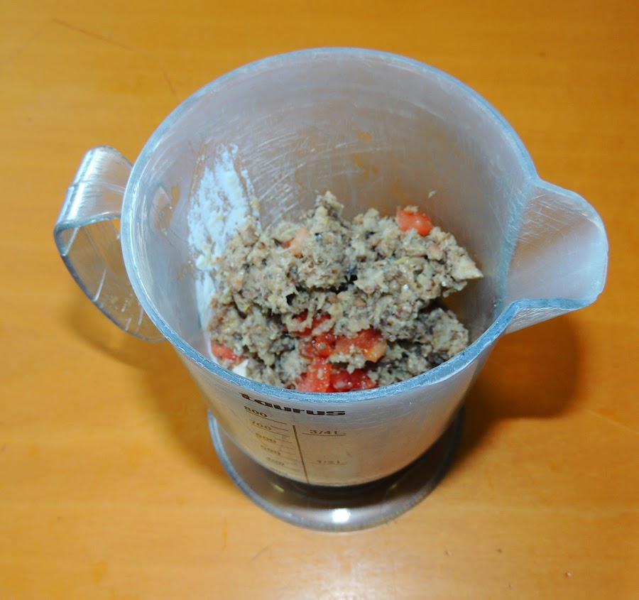 Se pone en el vaso de la batidora junto con el queso troceado, el yogur y el tomate cortado en trozos muy pequeños. Se agrega un poco de pimienta.