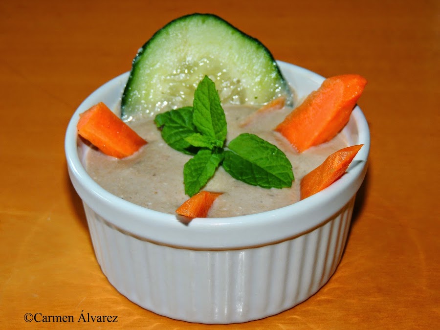 Se meten al frigorífico unas dos horas y cuando se van a servir se adornan con barritas de zanahoria, unas rodajas muy finas de pepino y la menta. Si no tenéis menta, puede ser con perejil.