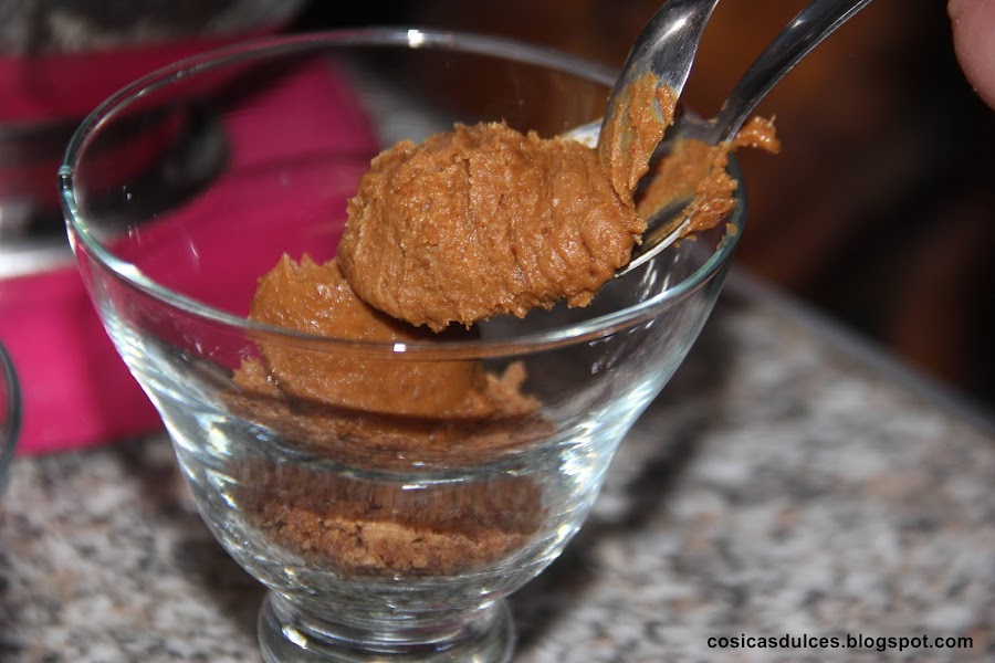 Procedemos al montaje de nuestras copas. En el fondo de las mismas ponemos una base de galleta picada mezclada con mantequilla y sobre la misma añadimos un par de cucharadas de crema de speculoos.