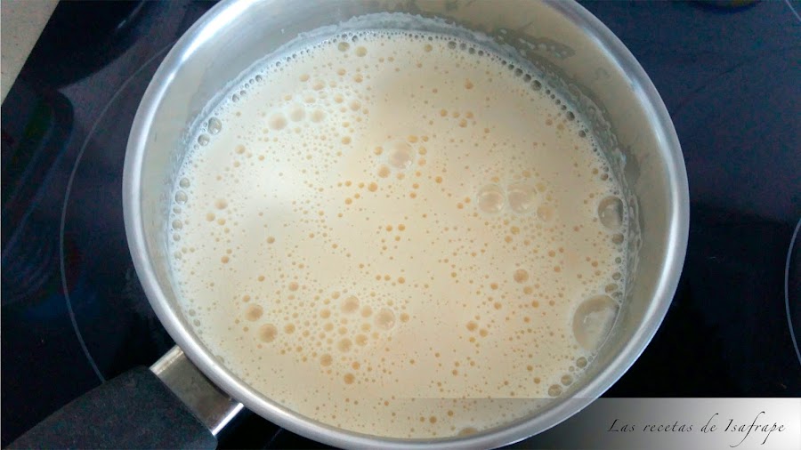 Ponemos la leche a calentar en un cazo y cuando comience a hervir la apartamos del fuego y añadimos el preparado de yemas con azúcar, lo mezclamos y volvemos a poner al fuego, removiendo para que no se pegue, hasta que rompa a hervir.