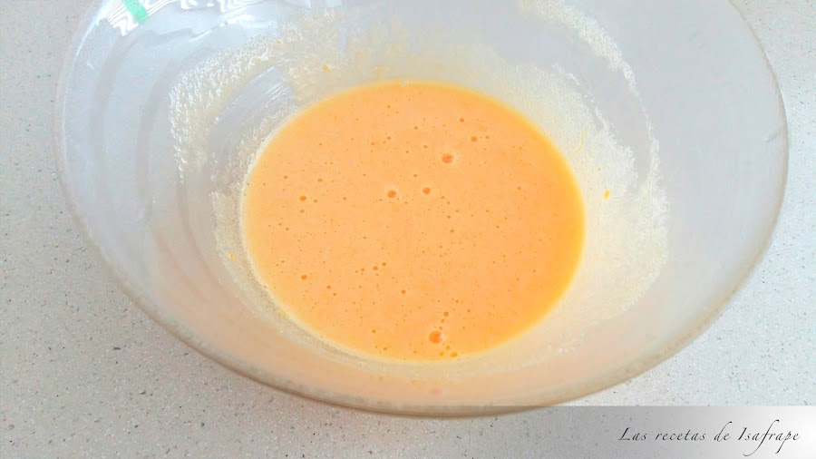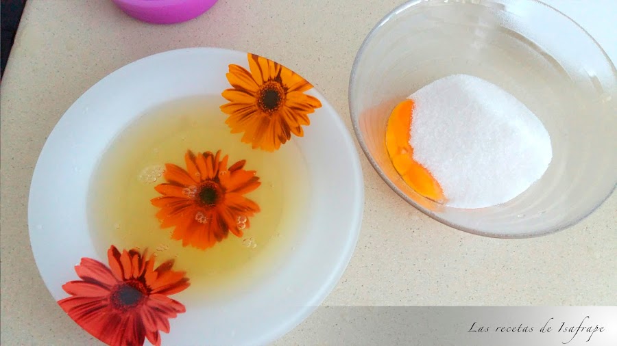 Separamos las yemas de las claras y mezclamos las yemas con el azúcar.