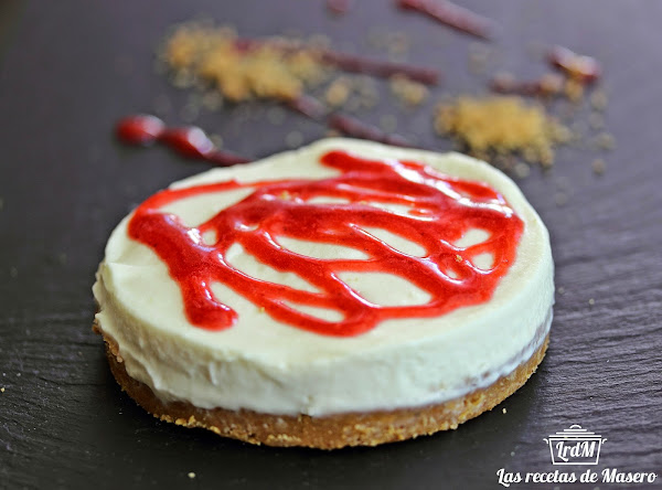 Cubrimos un plato de fondo plano con papel de horno y colocamos encima cuatro aros de emplatar de 7 cm de diámetro. Para hacer la base, mezclamos las galletas trituradas con la mantequilla y las repartimos entre los aros, presionando para que quede una base de galletas compacta.