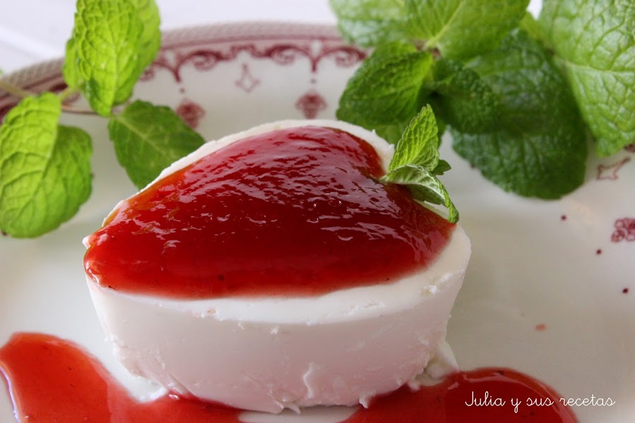 Desmoldamos la mousse y le ponemos el coulis por encima. También podemos ponerle una hoja de gelatina al coulís y poner un poquito en el fondo de los moldes, dejar que cuaje en el frigorífico y después rellenarlos con la mousse de yogur, al desmoldarlos quedará encima...como más os guste...